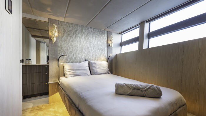 The interior layout allows for four cabins, accommodating eight guests. The configuration comprises a full-beam master suite, VIP and one guest double. All accommodation is on the lower deck and there’s an additional ensuite cabin for two crew.